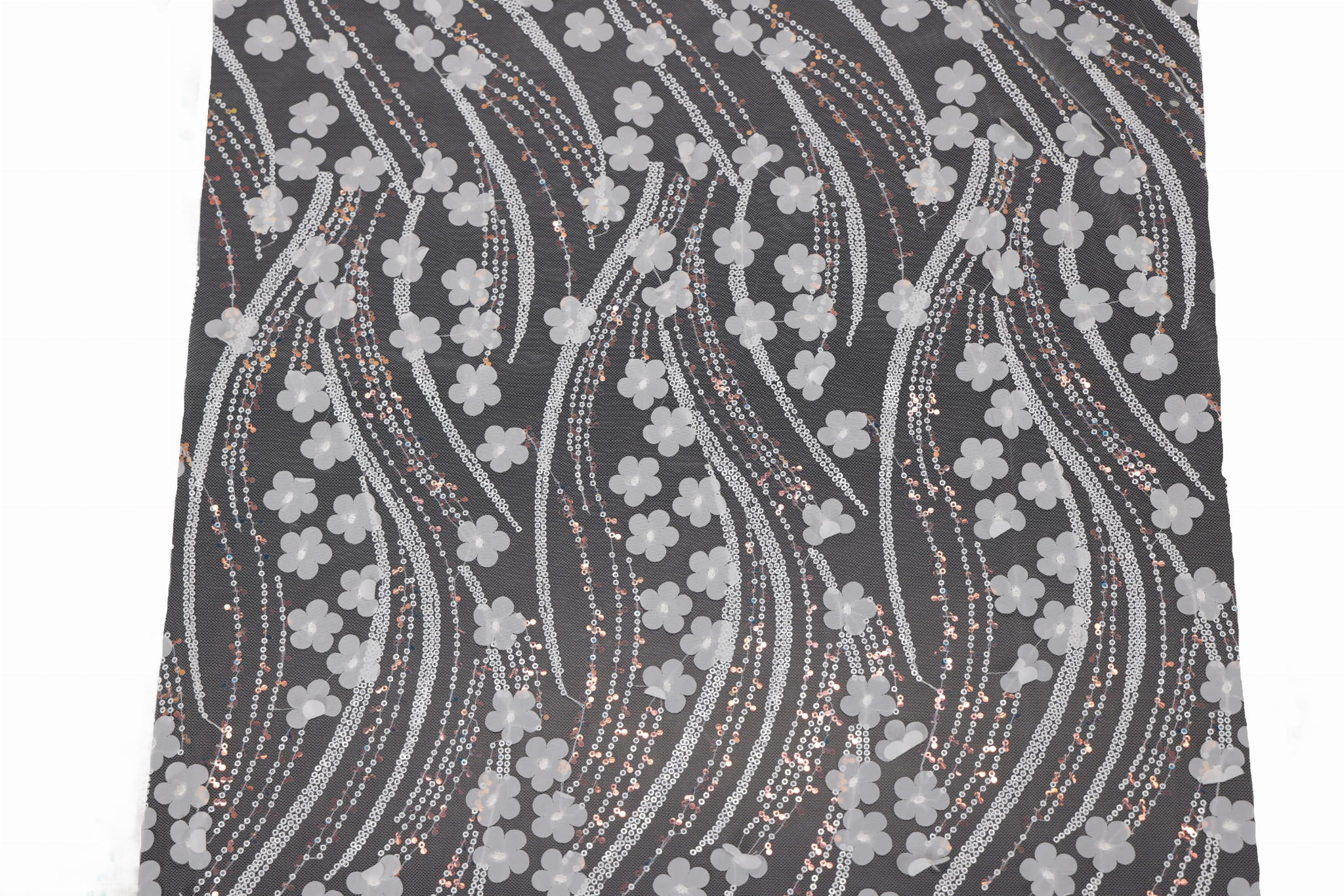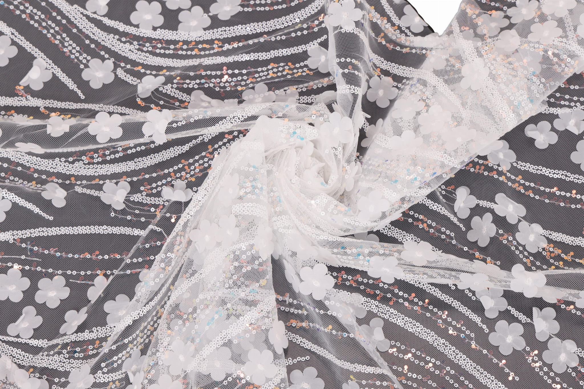 Descubra nuestro tul decorativo con lentejuelas cosidas y flores de tela – un material único y llamativo, con una textura rica, que atrae todas las miradas y aporta elegancia y un carácter tridimensional a los proyectos. Es ideal para vestidos infantiles, vestidos de noche y de ceremonia, así como para decoraciones de interiores. La base de tul transparente, combinada con aplicaciones decorativas, crea un lujoso efecto 3D.
