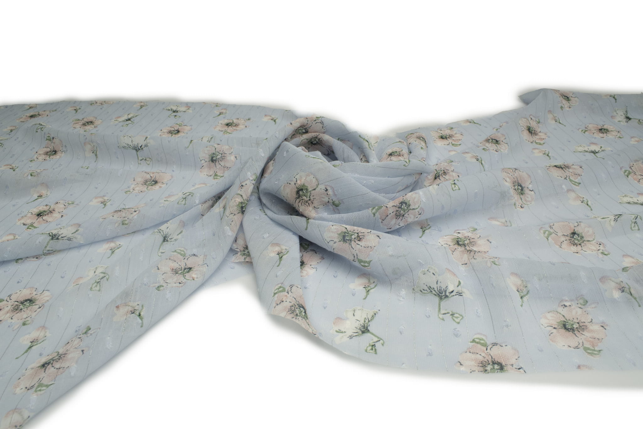 A légies és finom sifon egy igazán fényűző anyag – nemes átlátszóság a fő előnye. A sifon szintetikus szálakból készült szövet, melynek köszönhetően nagy tartósság, valamint kopásállóság és használat közbeni károsodás jellemzi. A laza szövés a sifont textilködszerűvé varázsolja, számos dekoratív és dekoratív alkalmazással. Az anyag tökéletesen kombinálható más szövetekkel. Az almavirágos nyomatot további csillogó szálak, arany és ezüst bevezetésével gazdagították, megvilágítva az anyagot. Enyhén texturált textúra.