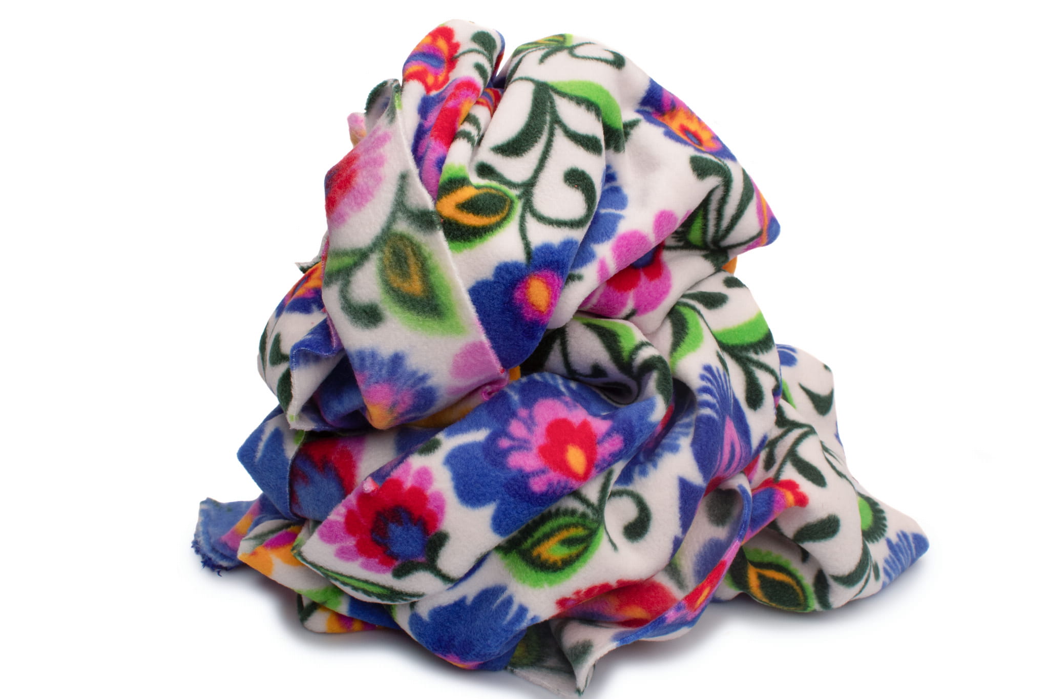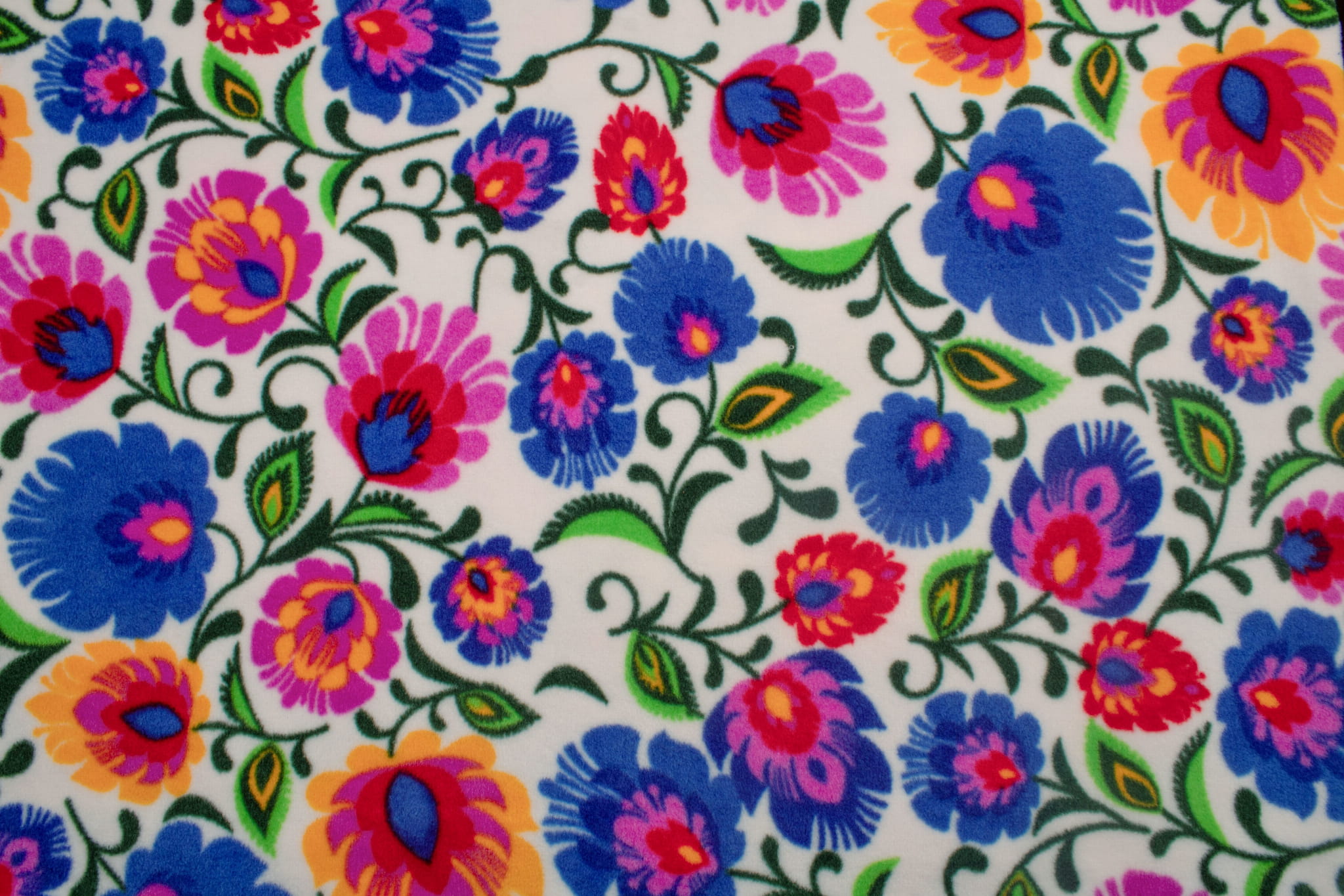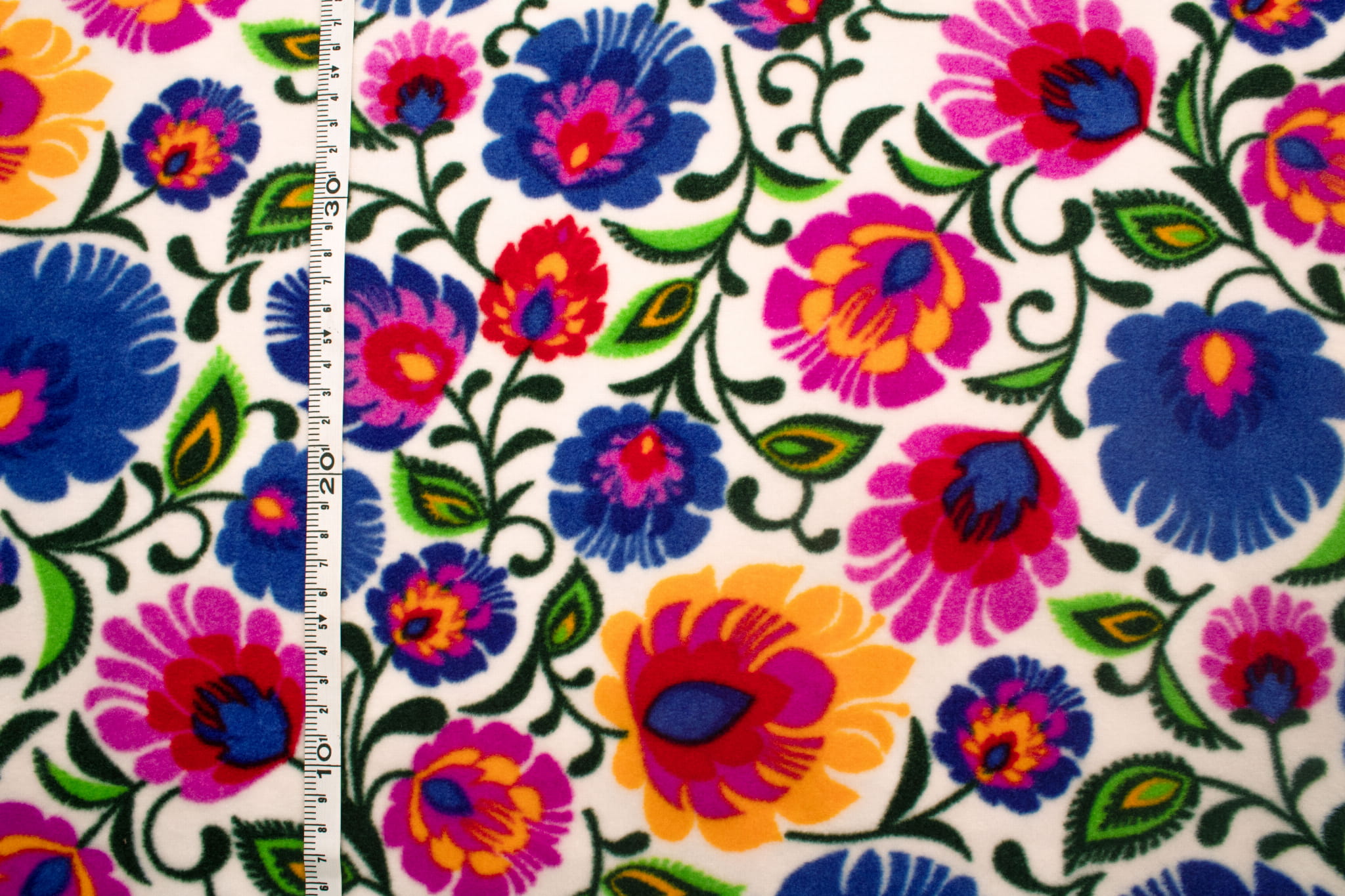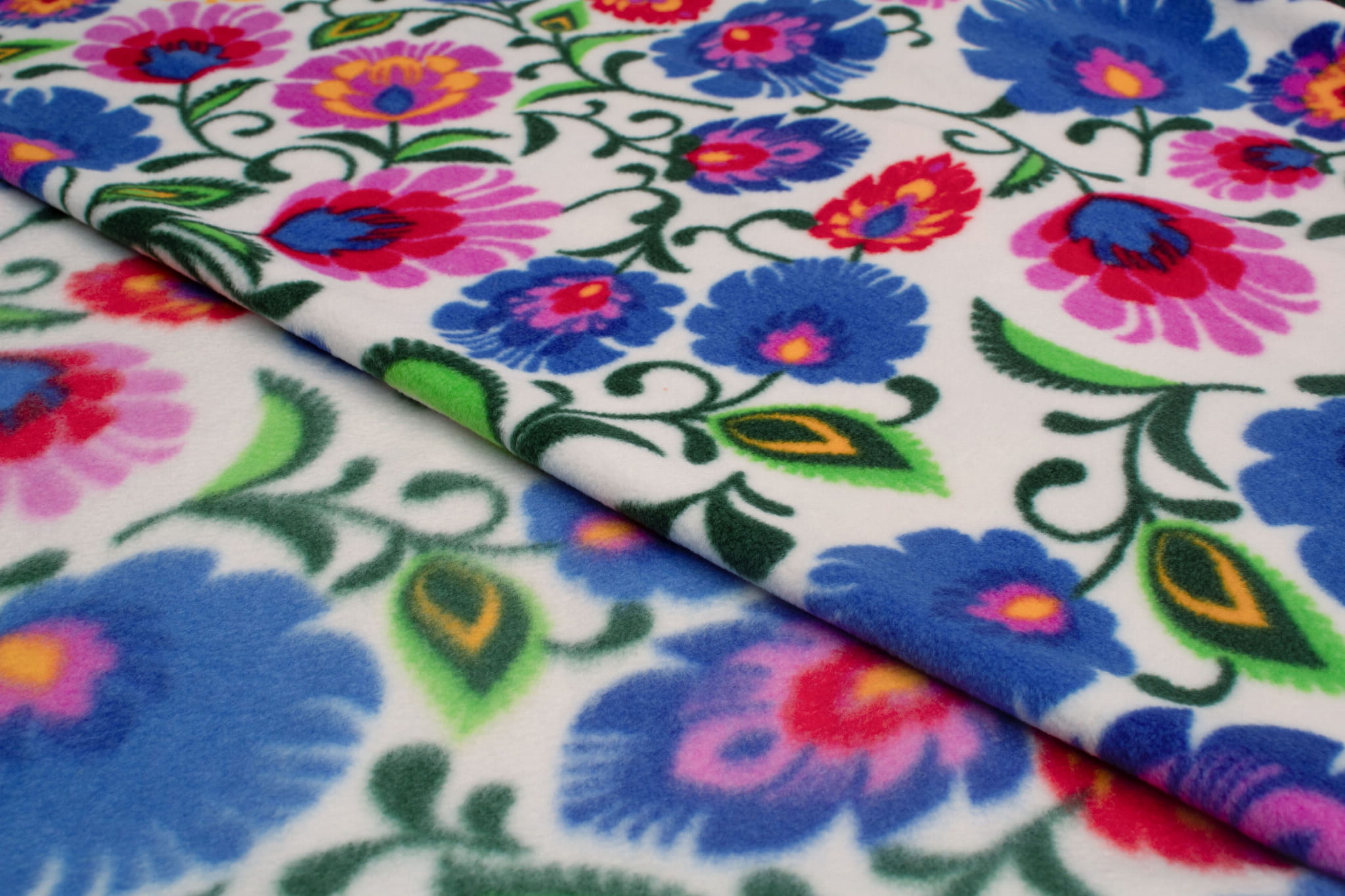 Fleecestof is gemaakt van polyester kunstvezels. Kunstvezels geven de stof hydrofobe eigenschappen, een hoge kreukbestendigheid en een hoge elasticiteit. Deze eigenschappen zorgen ervoor dat het fleece zeer snel droogt en niet hoeft te worden gestreken. Het belangrijkste voordeel van fleece is echter de uitstekende bescherming tegen kou. Dit bedrukte fleece is gemaakt met behulp van DTY-technologie, zodat we u een materiaal van hogere kwaliteit kunnen bieden. DTY-fleece heeft een gladdere en zachtere textuur dan klassiek fleece. Het pillt niet, is zeer resistent en duurzaam. De stof rekt over de breedte. De fleece is versierd met een duurzame print met folkpatronen van Łowicz. De kleuren zijn zeer divers en intens. De print is aan beide zijden, maar er is een duidelijk zichtbaar verschil tussen de linker- en rechterzijde van de stof. Verkrijgbaar in 3 kleurenversies.