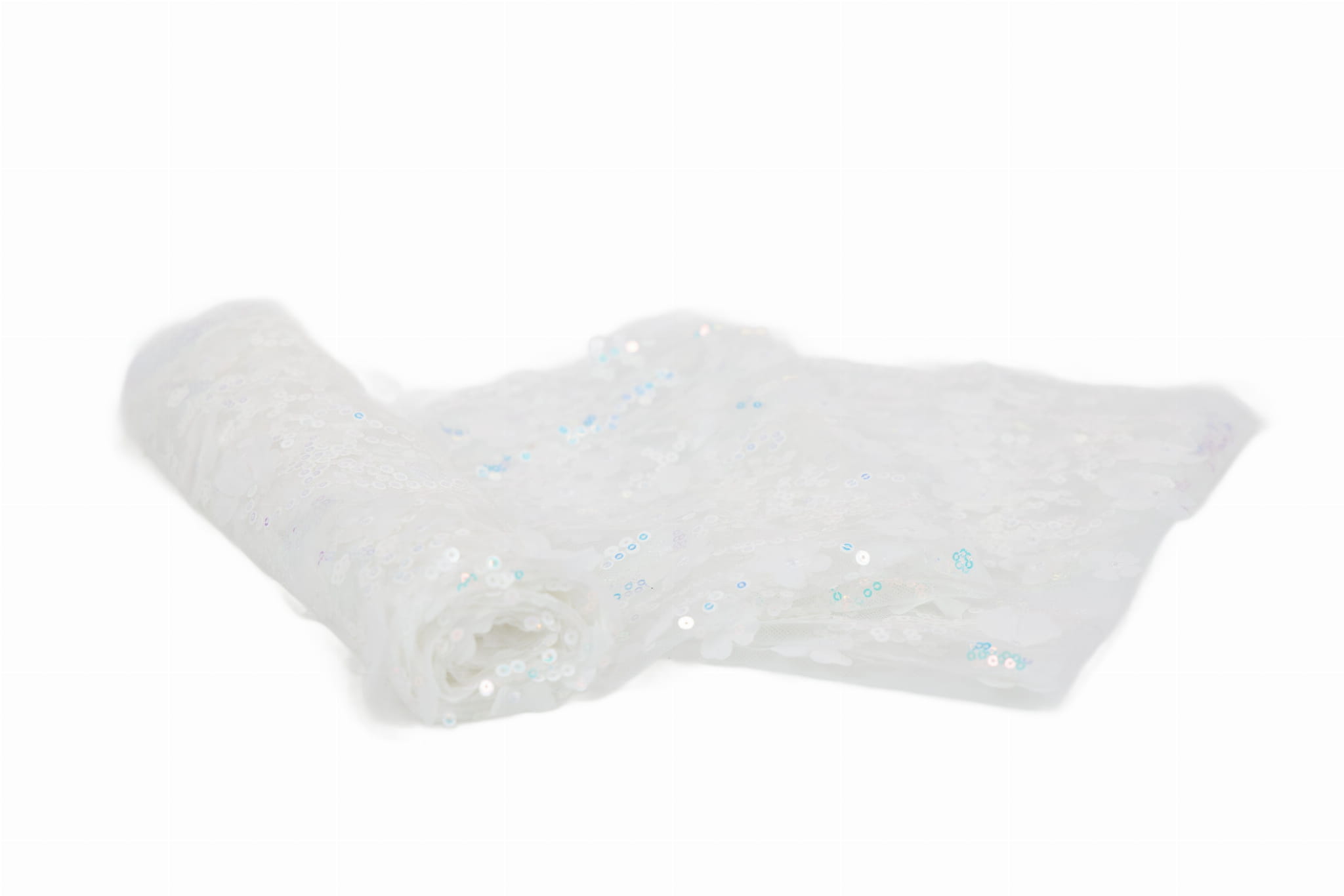 Ontdek onze decoratieve tule met vastgenaaide pailletten en stoffen bloemen – een uniek en opvallend materiaal met een rijke textuur dat de aandacht trekt en projecten elegantie en een ruimtelijk, driedimensionaal karakter geeft. Ideaal voor meisjesjurken, avond- en feestjurken, evenals voor interieurdecoraties. De transparante tulebasis in combinatie met decoratieve applicaties zorgt voor een luxueus 3D-effect.