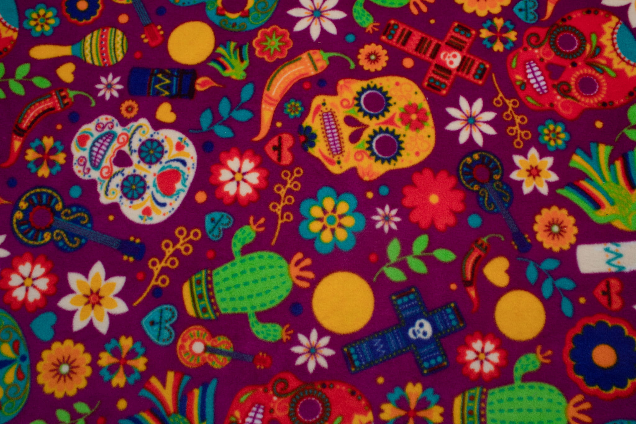 Dzianina polarowa wykonana jest z poliestrowych włókien sztucznych. Sztuczne włókna zapewniają dzianinie właściwości hydrofobowe a także wysoką odporność na zagniecenia i dużą elastyczność. Te cechy sprawiają, że polar bardzo szybko wysycha i nie wymaga prasowania. Najważniejszą zaletą polaru jest jednak doskonała ochrona przed zimnem. Ten Polar drukowany został wykonany przy użyciu technologii DTY, dzięki czemu możemy Państwu zaoferować materiał wyższej jakości. Polar DTY charakteryzuje się gładszą i bardziej miękką fakturą niż klasyczny polar. Nie mechaci się, jest bardzo wytrzymały i trwały. Dzianina rozciąga się po szerokości. Polar zdobi trwały nadruk w motyw Dia de Muertos, nawiązującego do Meksykańskiego święta zmarłych. Jest przepełniony symbolami, bardzo kolorowy. Nadruk jest obustronny, jednak jest wyraźnie widoczna różnica między lewą a prawą stroną dzianiny. Dostępny w 3 wersjach kolorystycznych.