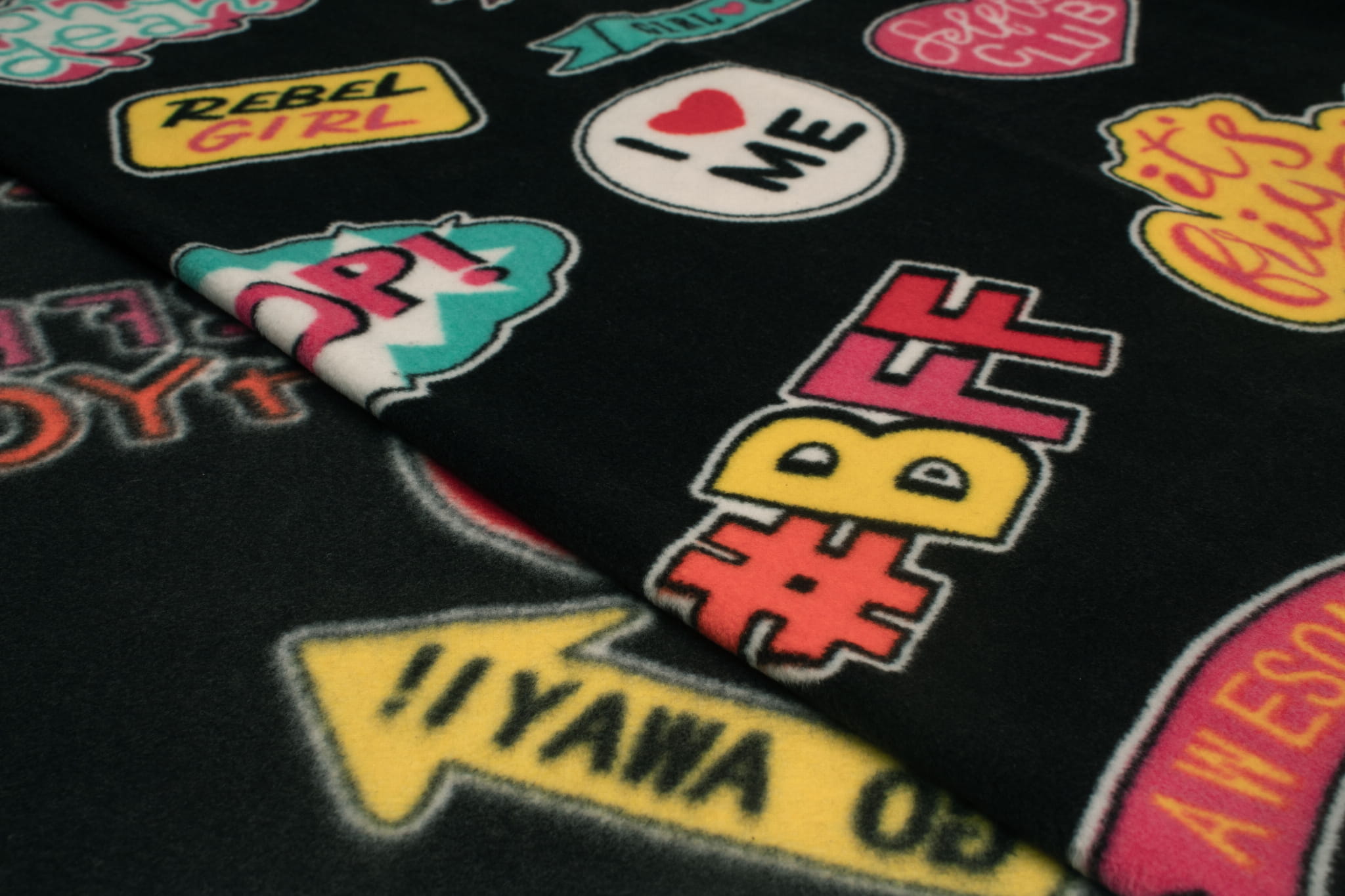 Dzianina polarowa wykonana jest z poliestrowych włókien sztucznych. Sztuczne włókna zapewniają dzianinie właściwości hydrofobowe a także wysoką odporność na zagniecenia i dużą elastyczność. Te cechy sprawiają, że polar bardzo szybko wysycha i nie wymaga prasowania. Najważniejszą zaletą polaru jest jednak doskonała ochrona przed zimnem. Ten Polar drukowany został wykonany przy użyciu technologii DTY, dzięki czemu możemy Państwu zaoferować materiał wyższej jakości. Polar DTY charakteryzuje się gładszą i bardziej miękką fakturą niż klasyczny polar. Nie mechaci się, jest bardzo wytrzymały i trwały. Dzianina rozciąga się po szerokości. Polar zdobi trwały, młodzieżowy nadruk z napisami i naklejkami. Nadruk jest obustronny, jednak jest wyraźnie widoczna różnica między lewą a prawą stroną dzianiny. Dostępny w 3 wersjach kolorystycznych.