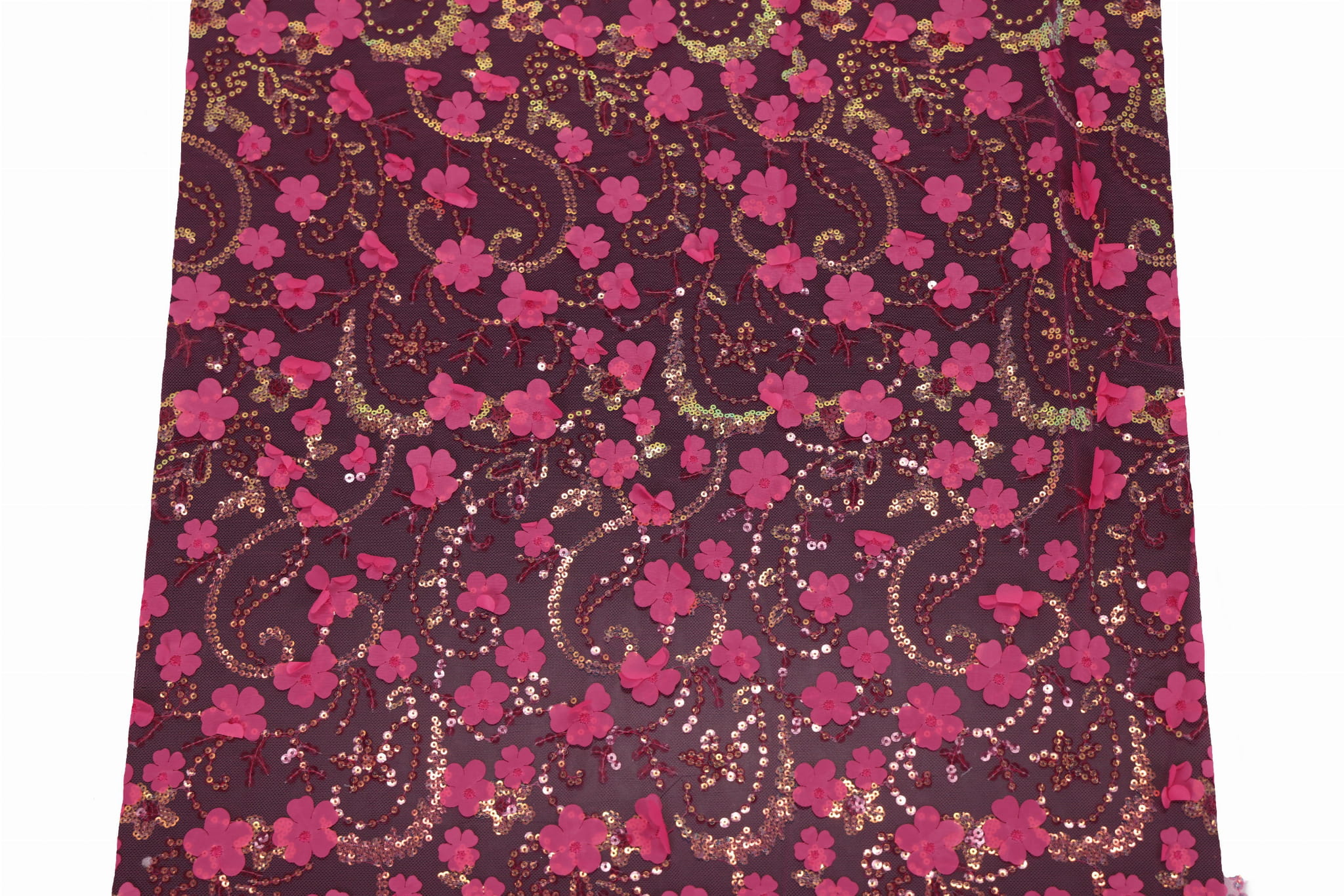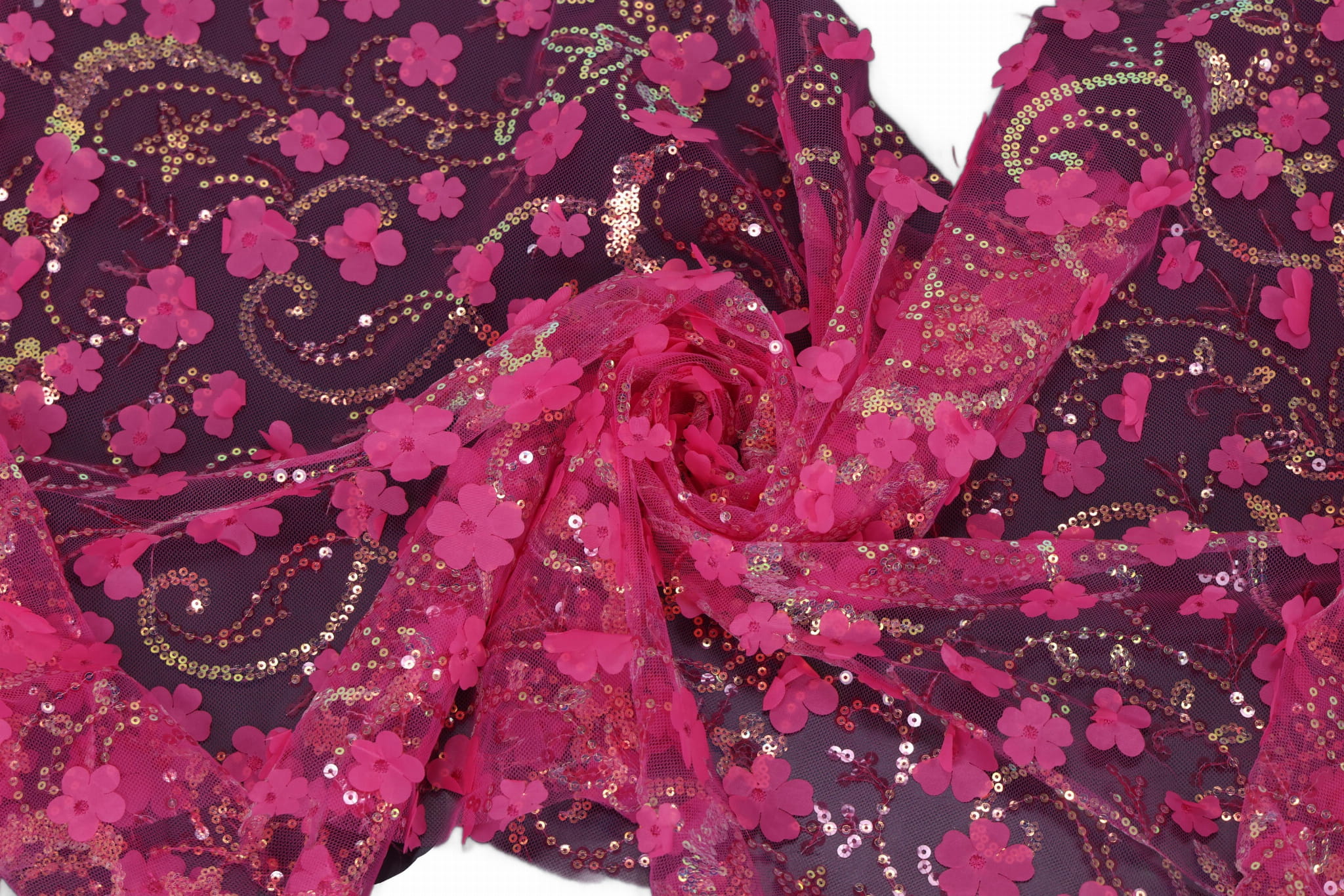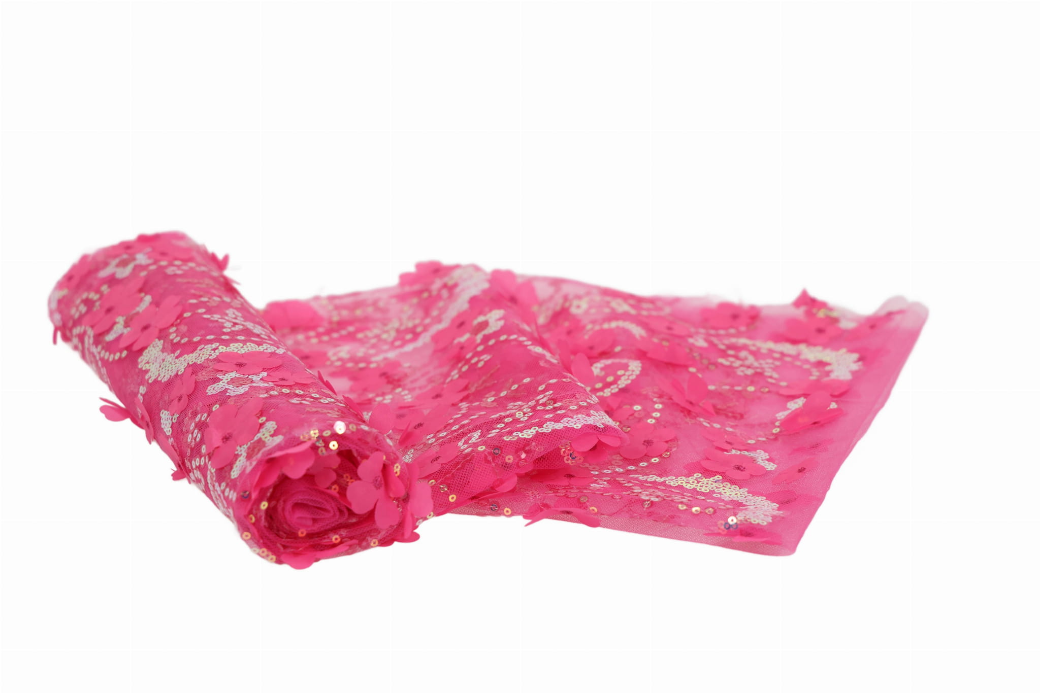 Objavte náš dekoratívny tyl s našitými flitrami a textilnými kvetmi – jedinečný, efektný materiál s bohatou štruktúrou, ktorý priťahuje pozornosť a dodáva projektom eleganciu aj priestorový, trojrozmerný charakter. Ideálny pre dievčenské šaty, spoločenské a večerné šaty, ako aj pre interiérové dekorácie. Transparentný tylový základ v kombinácii s dekoratívnymi aplikáciami vytvára luxusný 3D efekt.